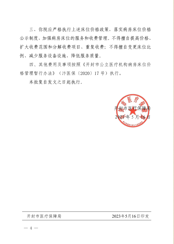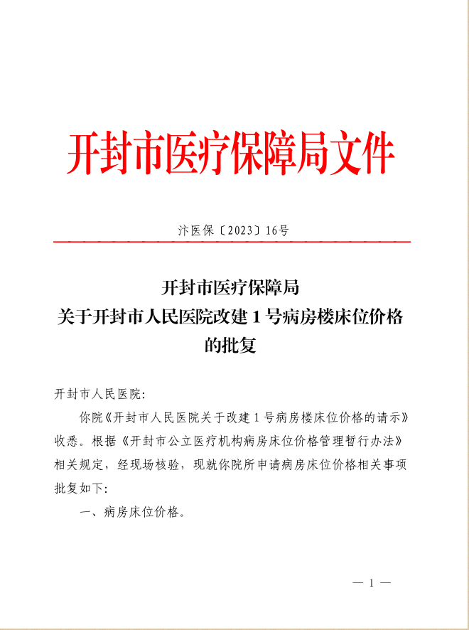 開封市醫(yī)療保障局關(guān)于開封市人民醫(yī)院改建1號病房樓床位價格的批復(fù)