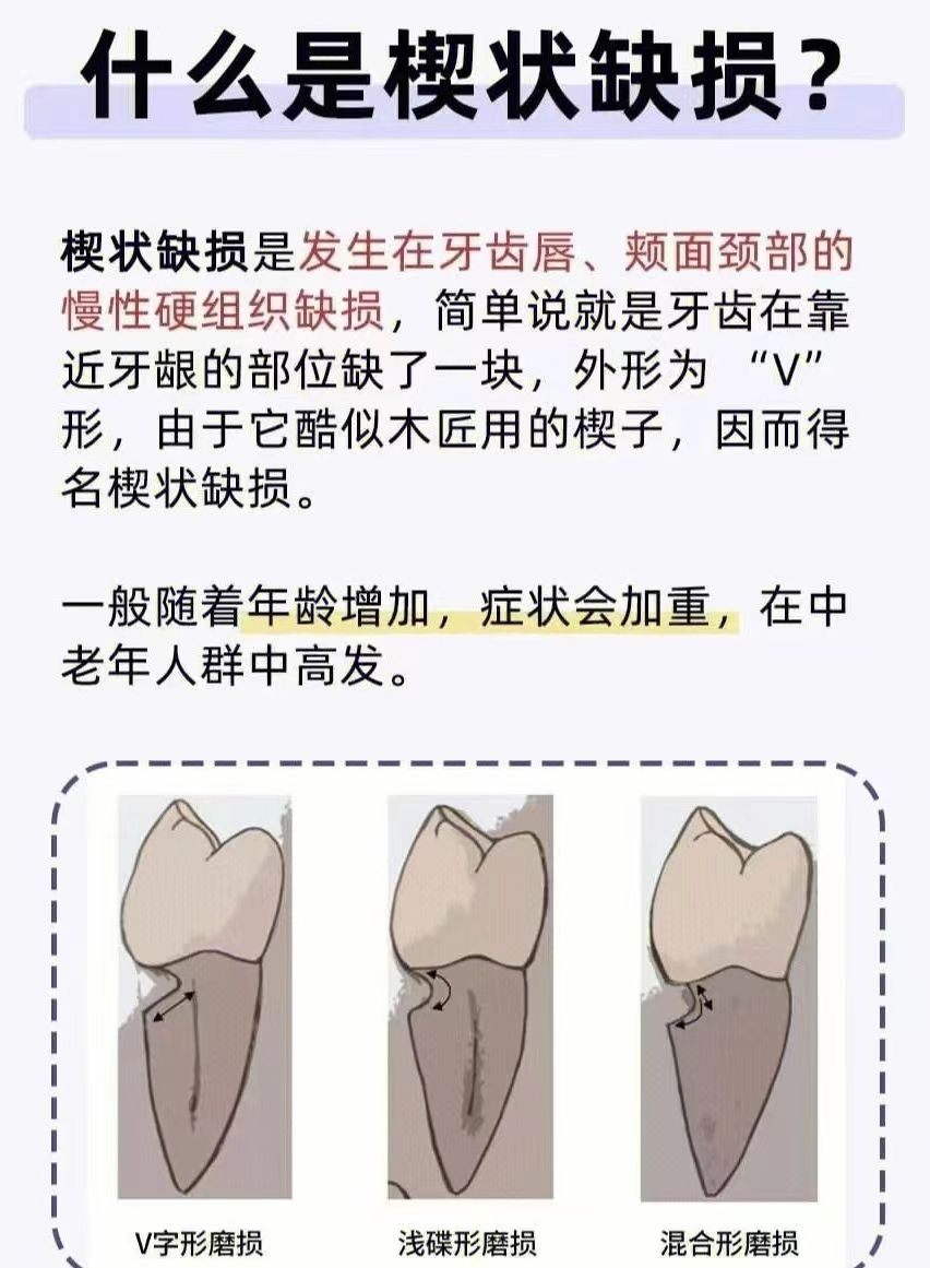 最常見的是楔狀缺損。多為發(fā)生在牙頸部的硬組織缺損。其原因多為機(jī)械摩擦(錯誤刷牙方法)酸蝕及應(yīng)力集中因素導(dǎo)致,因口大底小形似楔子,故得名。